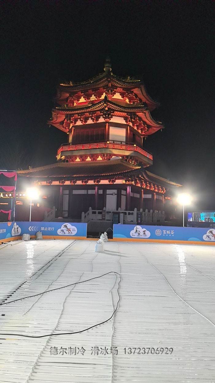 南京市溧水區(qū)無想水鎮(zhèn)富城薈室外滑冰場,建設(shè)于2024年春節(jié)前的數(shù)九寒冷天氣,在春節(jié)到來前夕,及時開業(yè),為周邊市民提供了春節(jié)期間娛樂好項目。該溜冰場為室外人工真冰溜冰場,由深圳市德爾制冷設(shè)備有限公司施工建造。此溜冰場為溧水區(qū)第一個室外真冰溜冰場,它位于無想水鎮(zhèn)富城薈廣場核心區(qū),古代建筑風(fēng)貌的街景與現(xiàn)代城市的消費形態(tài)相得益彰。夜晚燈光璀璨時,映在冰面的燈光霓虹閃爍,與周邊街景構(gòu)成一幅色彩斑斕的夜色美景。